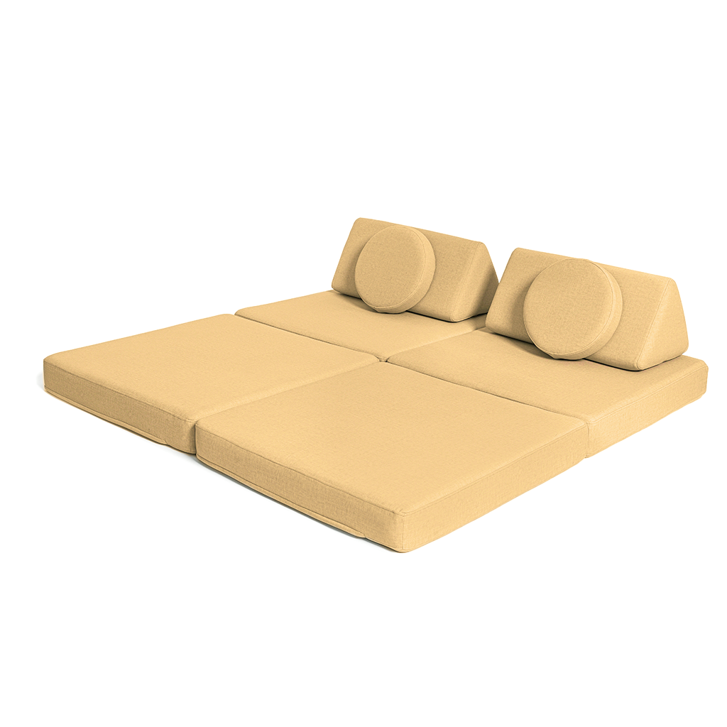 Nasza sofa została zaprojektowana tak, aby odpowiednie ułożenie tkaniny powodowało naturalne tarcie między elementami. Bazowe poduszki są zszyte na stałe. To sprawia, że można z niej budować najbardziej wymyślne konktrukcje oraz wygodnie na niej spać.
