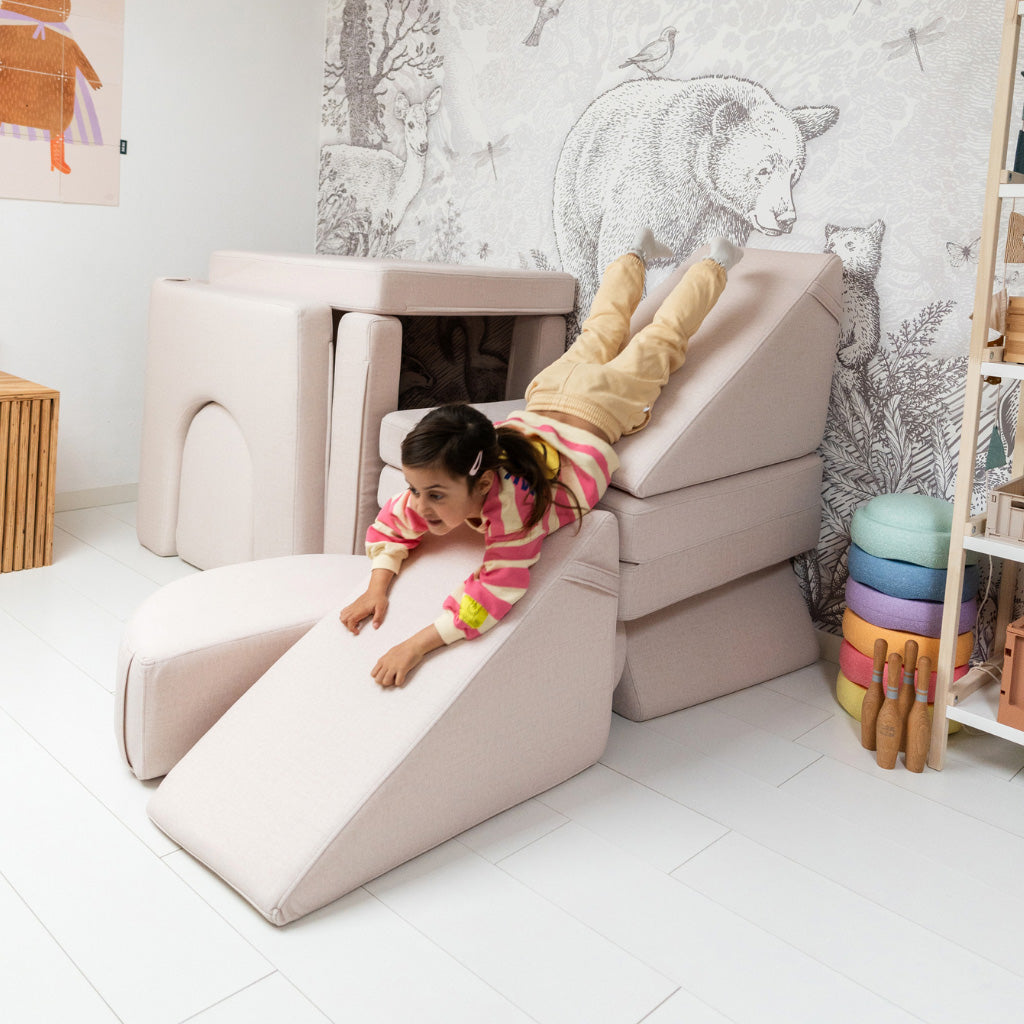 Shappy to modułowa sofa do zabawy, która zamienia pokój dziecka w kreatywną przestrzeń pełną przygód. Idealna do budowania baz, zjeżdżalni, tuneli czy miejsc do odpoczynku – wspiera rozwój, aktywność i wyobraźnię.