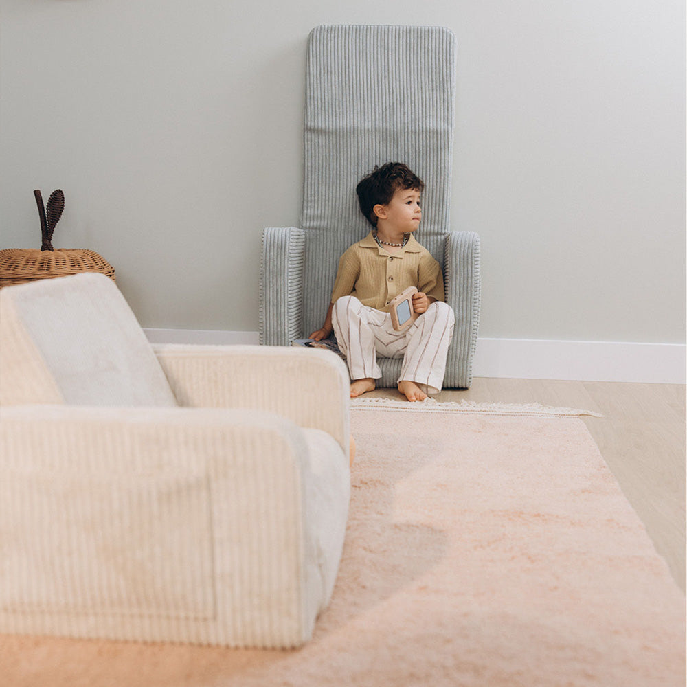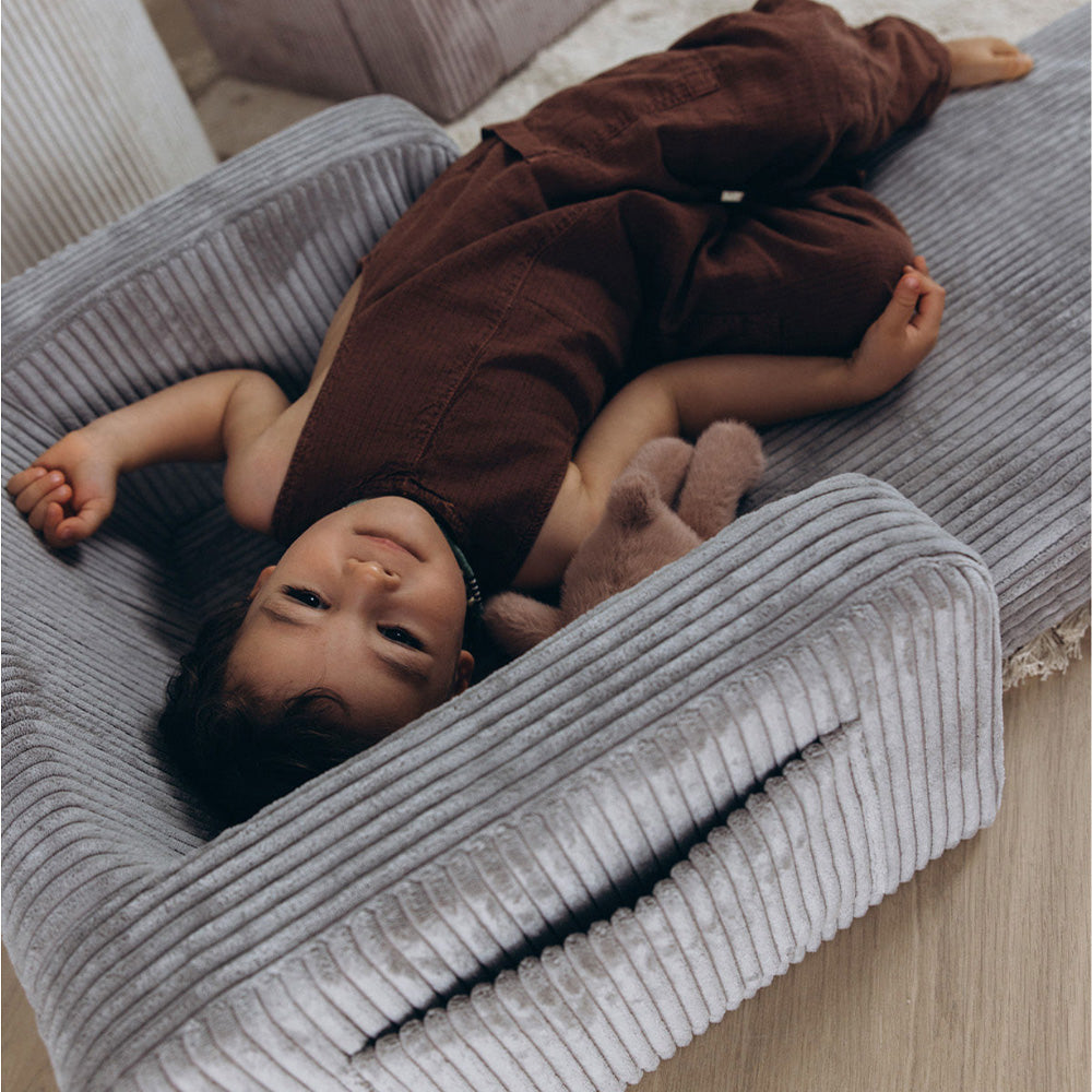 Lumi to 2-w-1 fotel, który zmienia się w miękką matę do drzemek. Zaprojektowany z myślą o codziennej zabawie, odpoczynku i chwilach wyciszenia — z możliwością prania pokrowca i bezpiecznymi materiałami.
