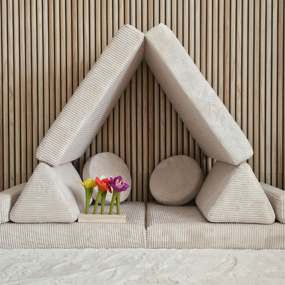 Nasza sofa została zaprojektowana tak, aby odpowiednie ułożenie tkaniny powodowało naturalne tarcie między elementami. Bazowe poduszki są zszyte na stałe. To sprawia, że można z niej budować najbardziej wymyślne konktrukcje oraz wygodnie na niej spać.
